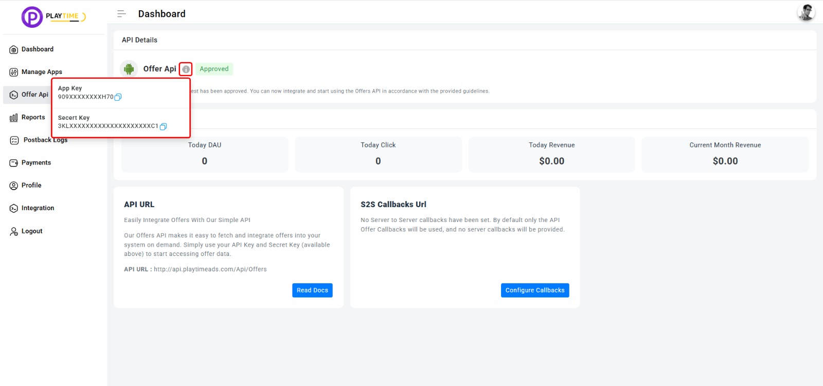 All requests must include your unique <mark style="background-color:orange;">App Key</mark> & <mark style="background-color:orange;">Secret Key</mark>, Which you will find in Offer Api section of your Dashboard. As shown in below image.